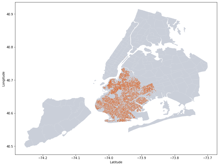 We see that the data well spread across Brooklyn. We can also observe several blank area in the middle, they are either parks, cemetery, or golf center, according to Google map.