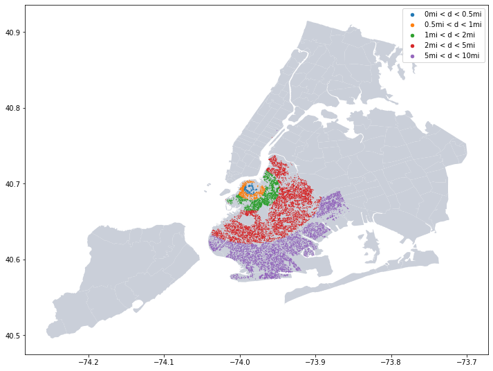 legend.append(str(dis_group[i]) + 'mi < d < ' + str(dis_group[i + 1]) + 'mi')